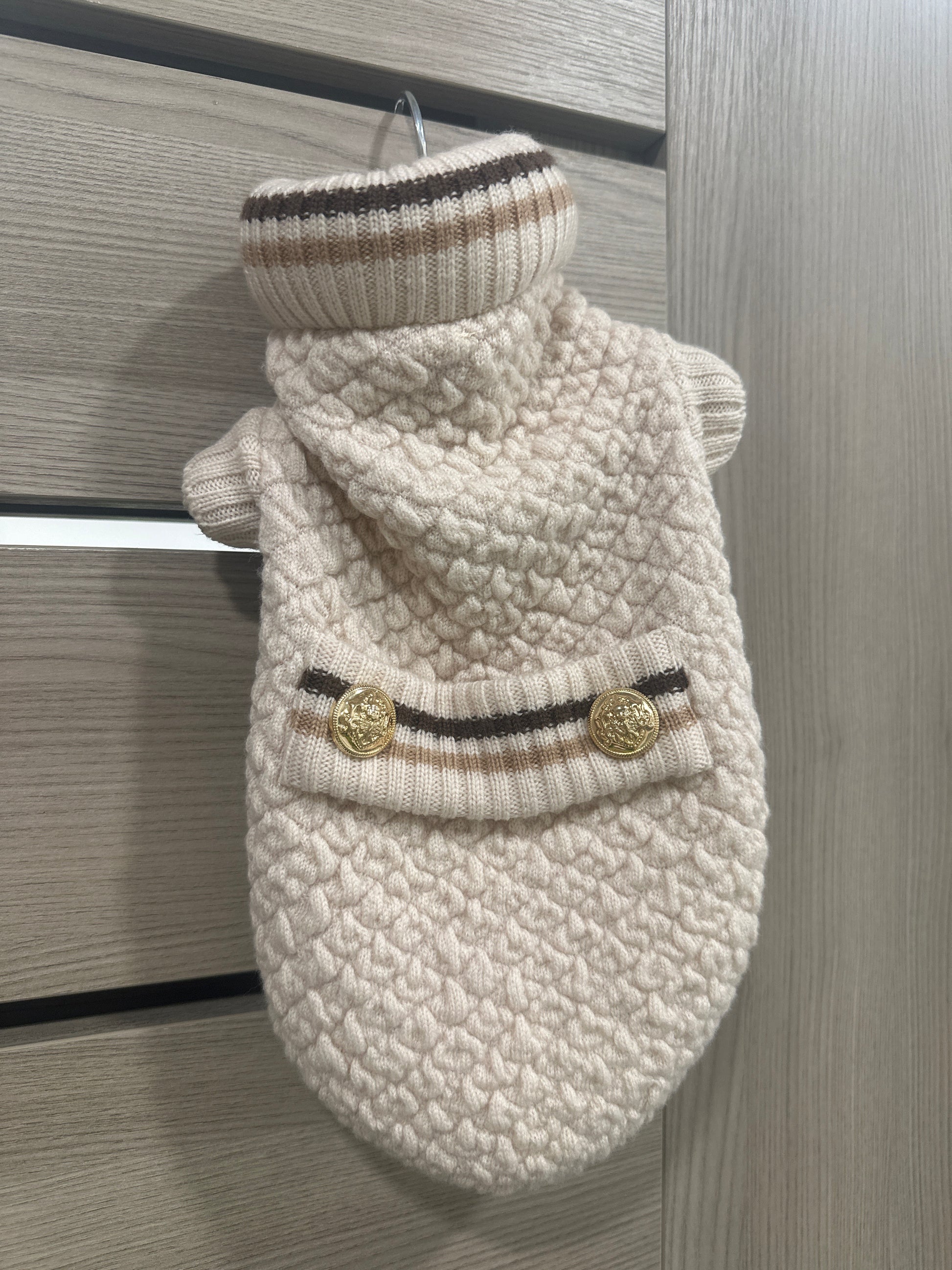 Elegantissimo il cappottino goffrato Gìgì color crema, in lana Merinos con collo alto a righe e mezza manica, arricchito da una martingala con doppio bottone dorato.