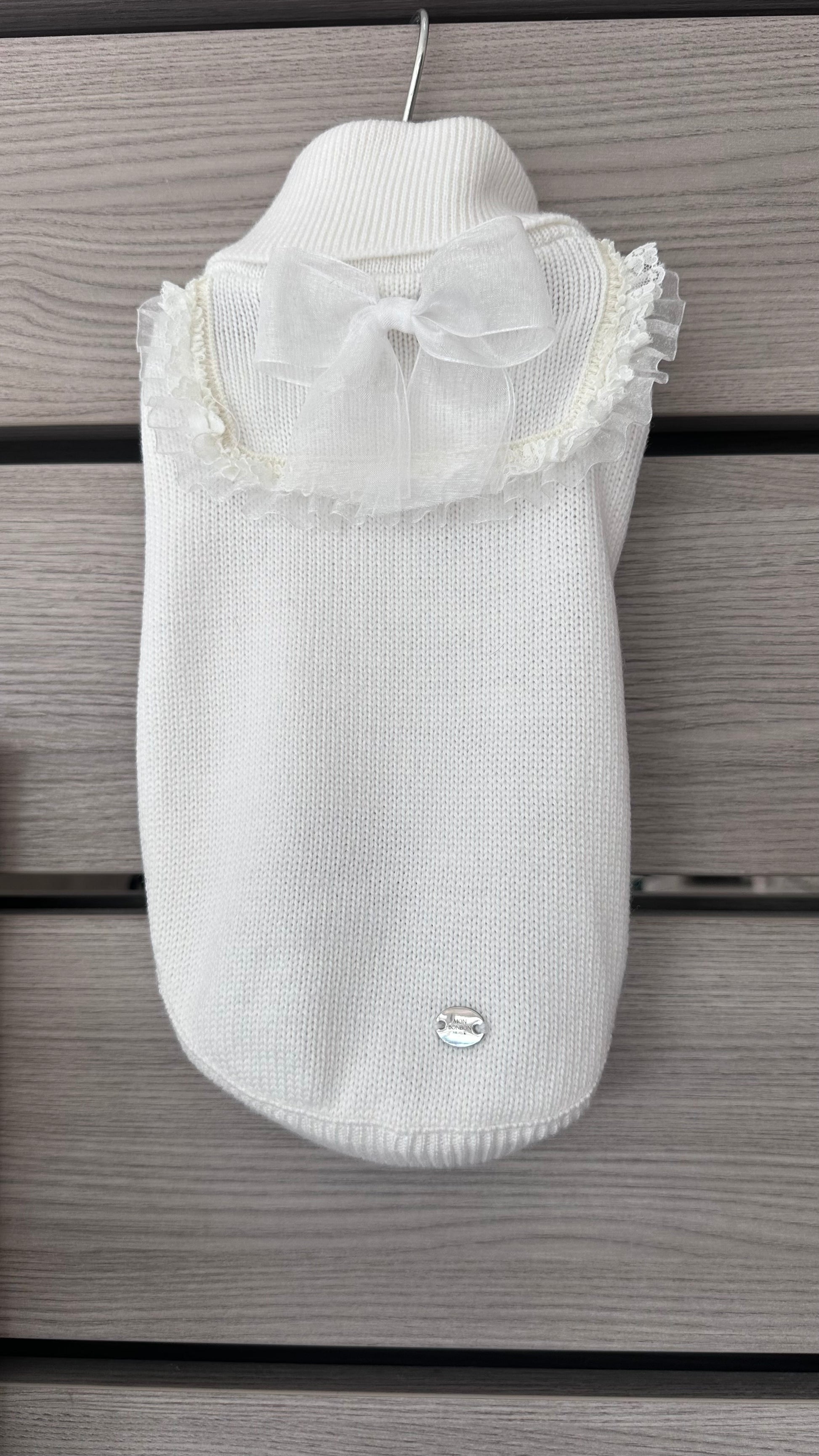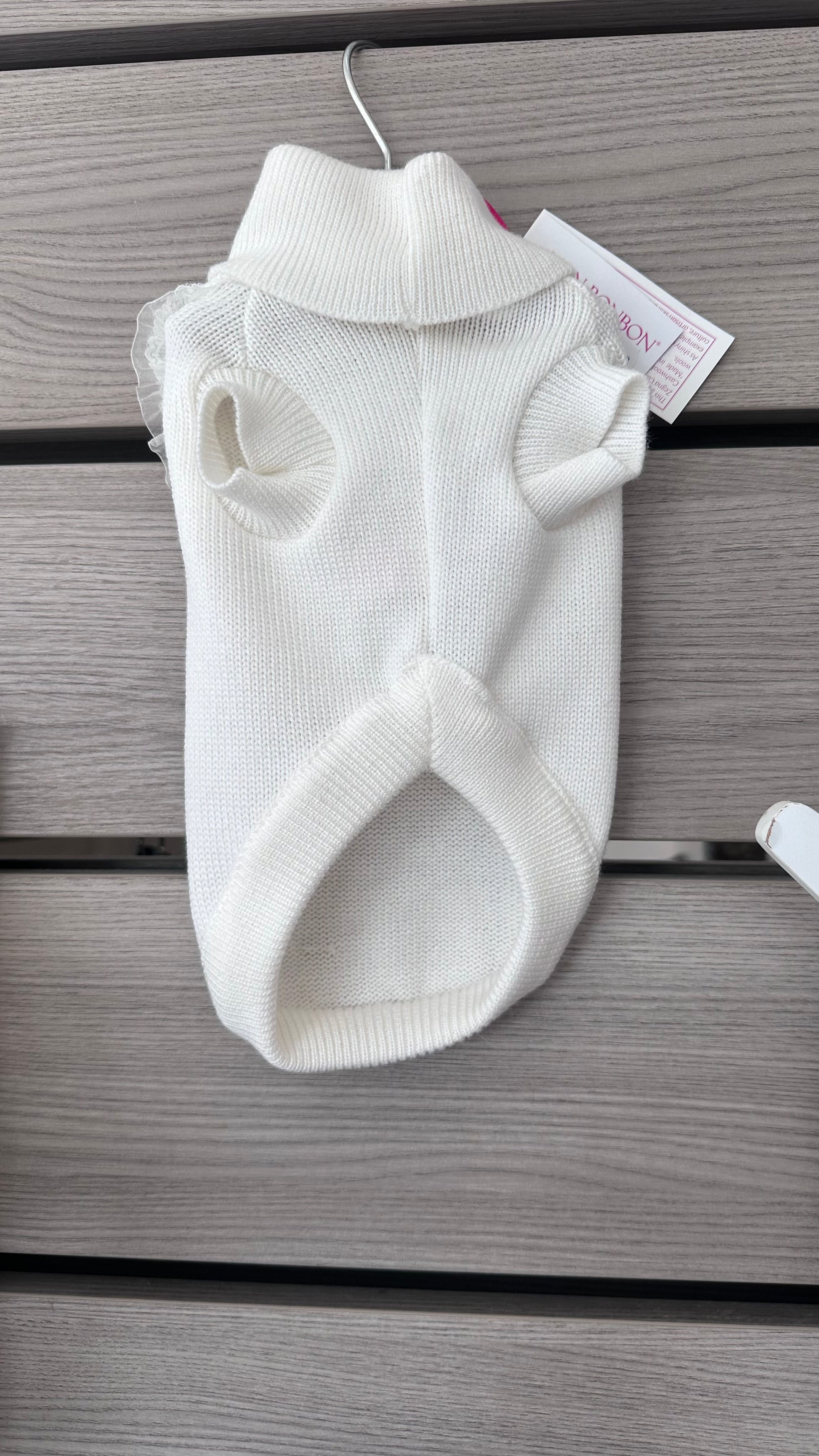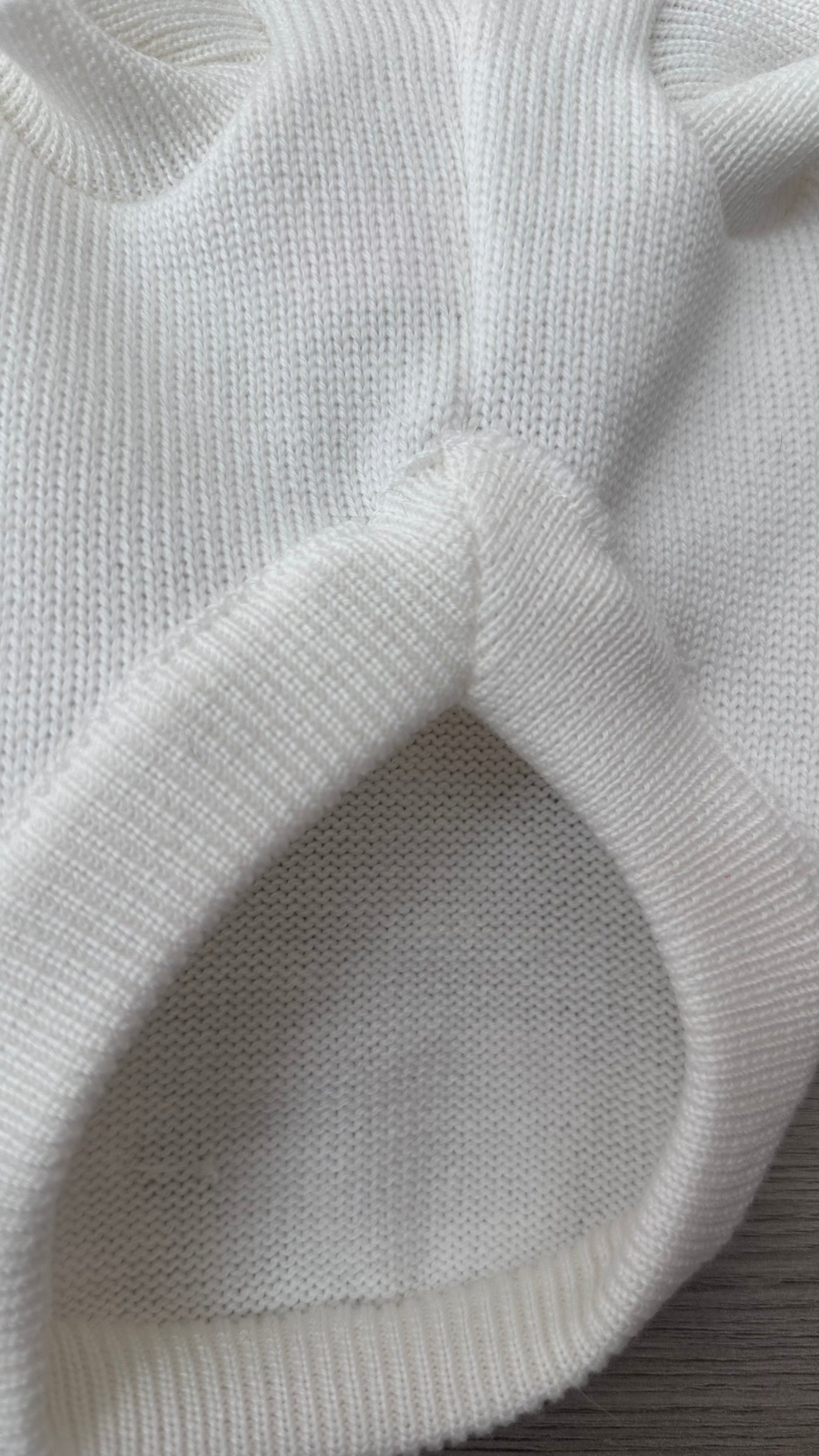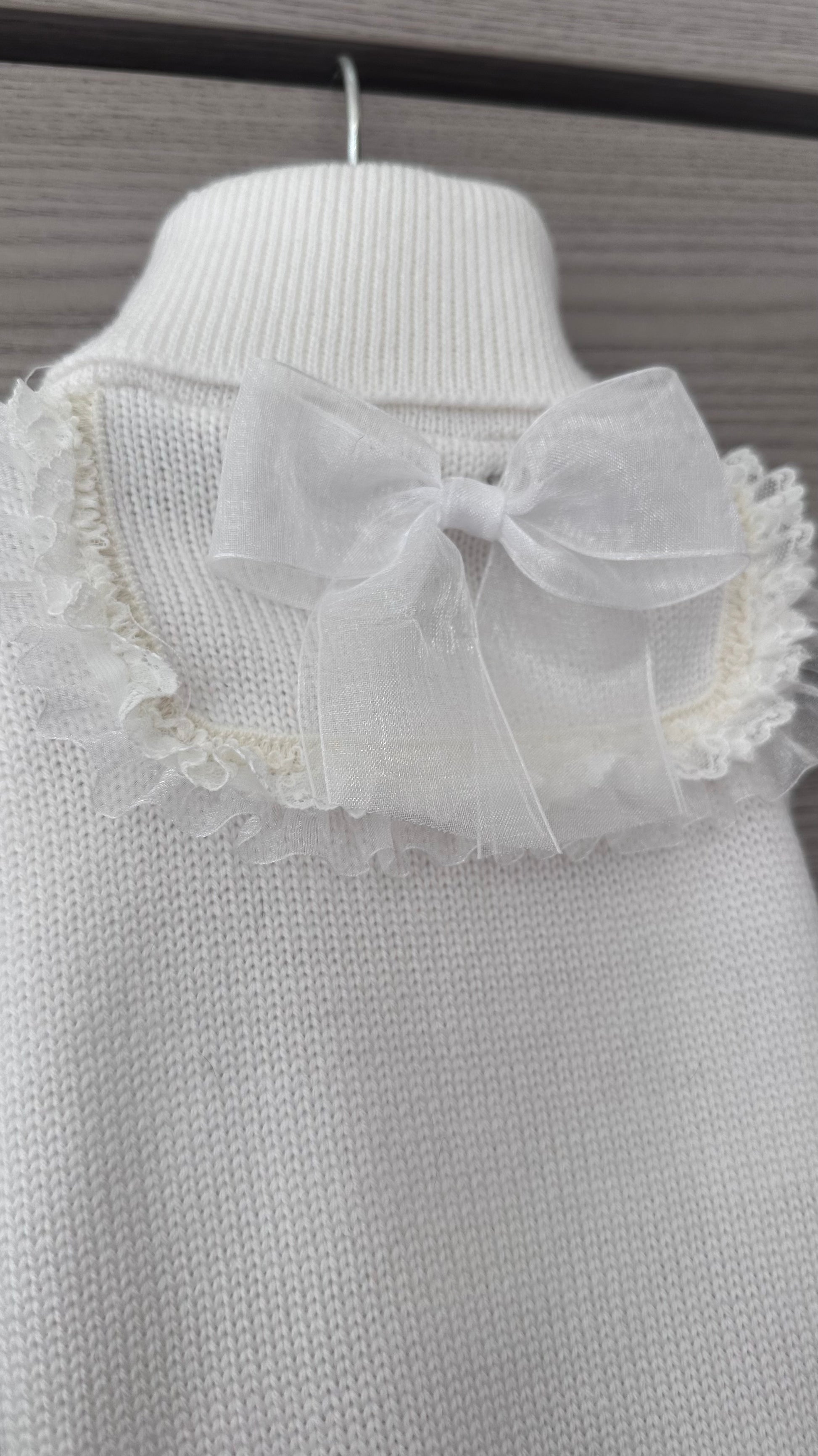 Delicato maglioncino in Cashwool E. Zegna color latte con decorazione attorno al collo e spilla a fiocco. Morbidissimo e caldo
