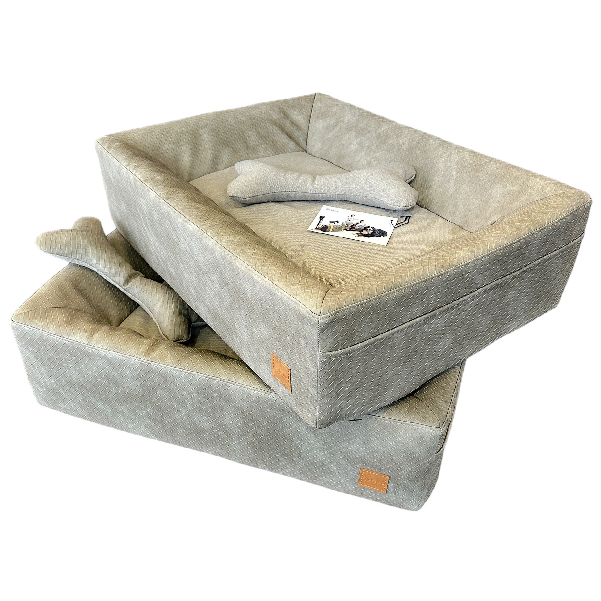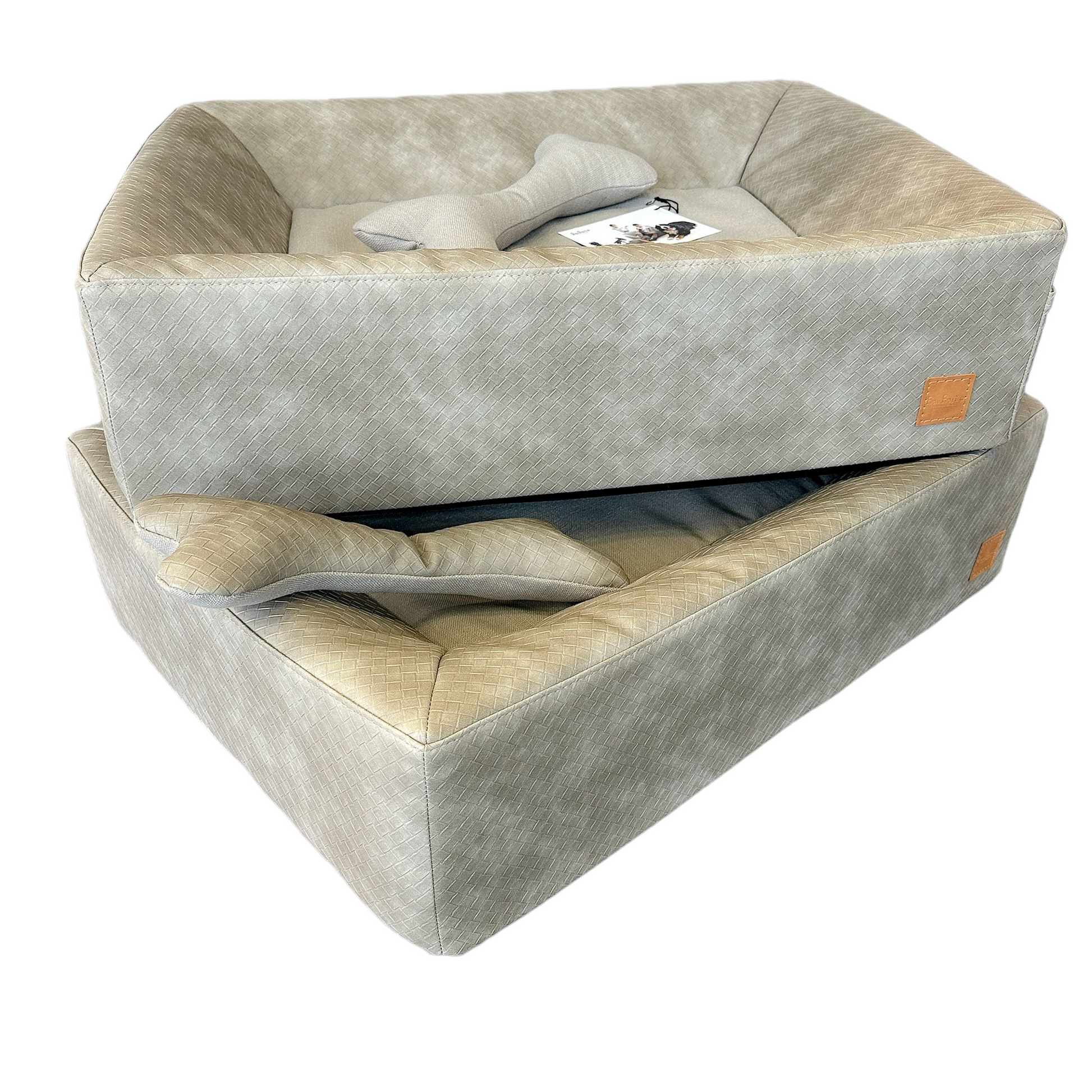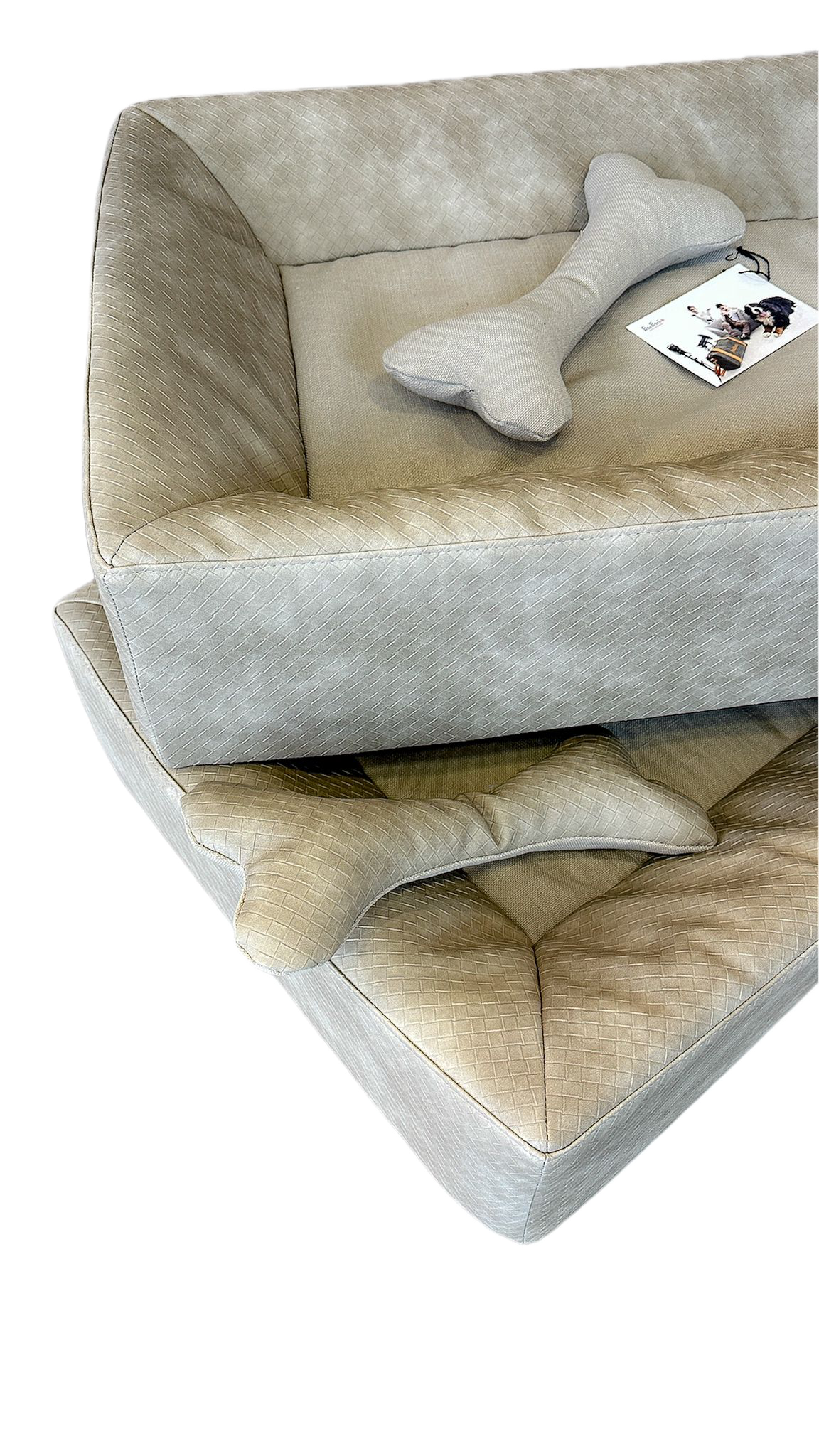 Un design moderno ed essenziale caratterizza la cuccia Zen, un materassino molto sostenuto in gommapiuma rivestito da ecopelle con effetto intrecciato color tortora.