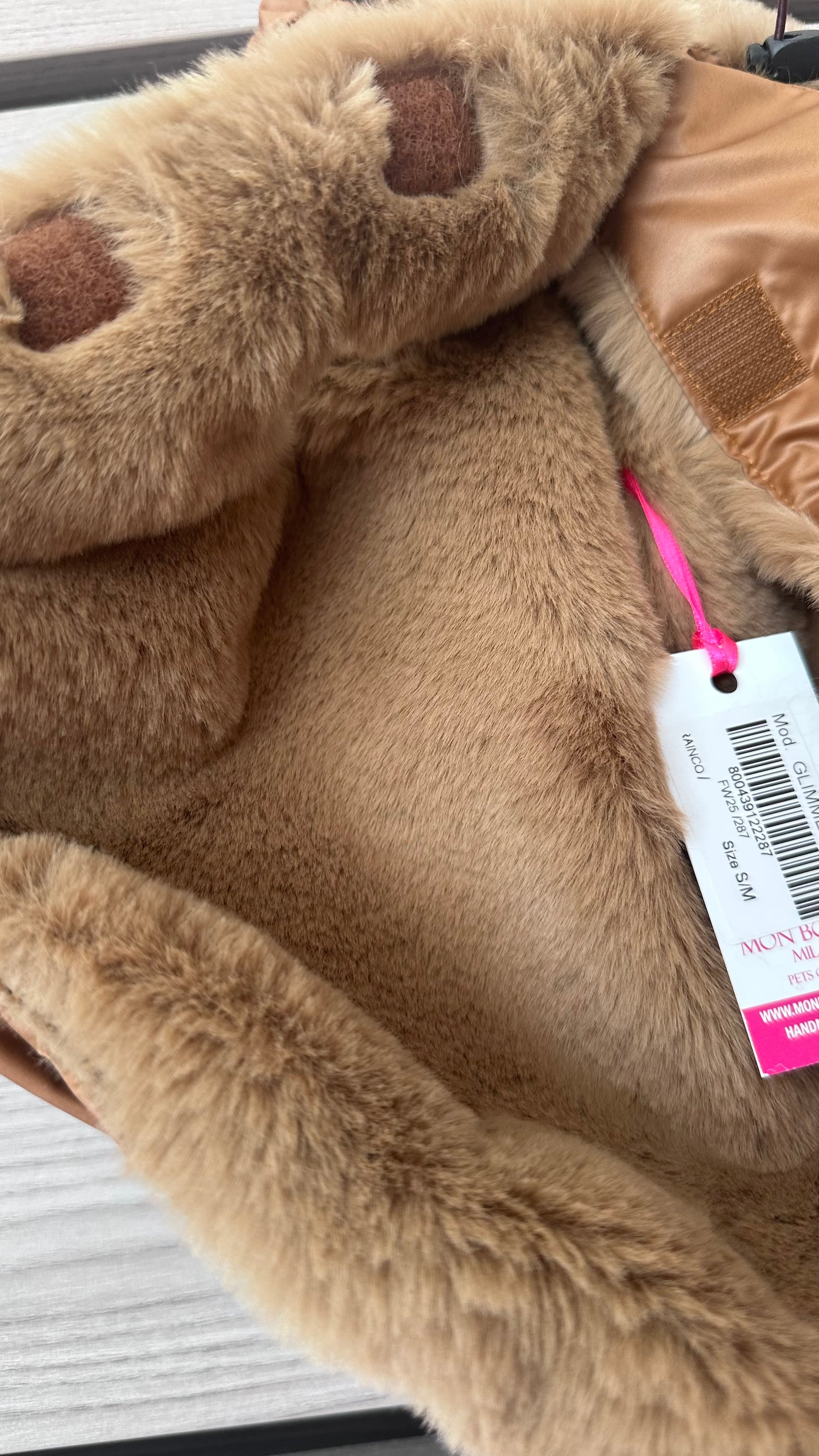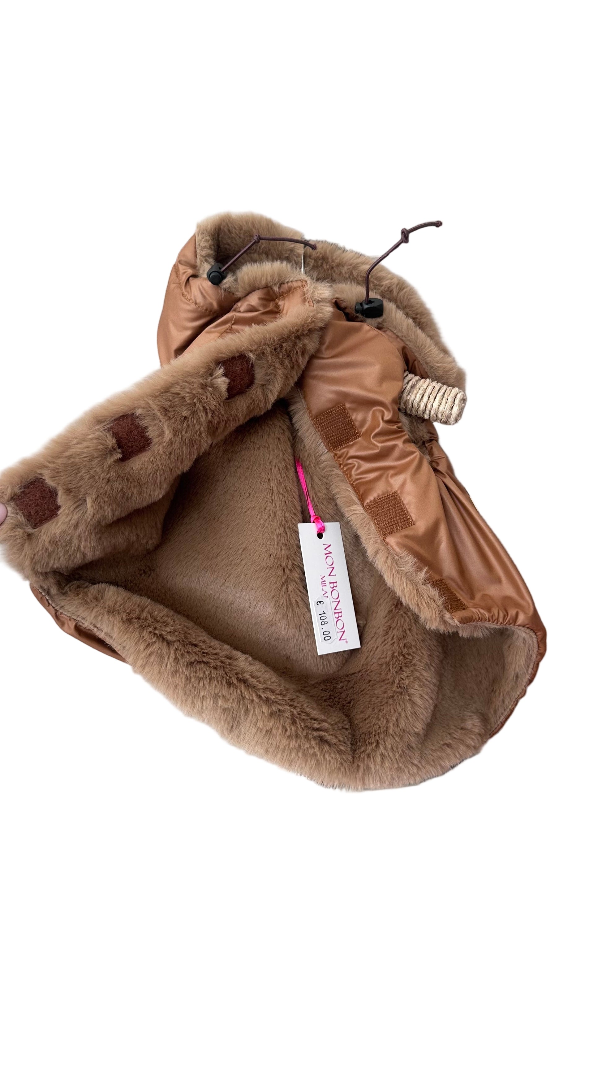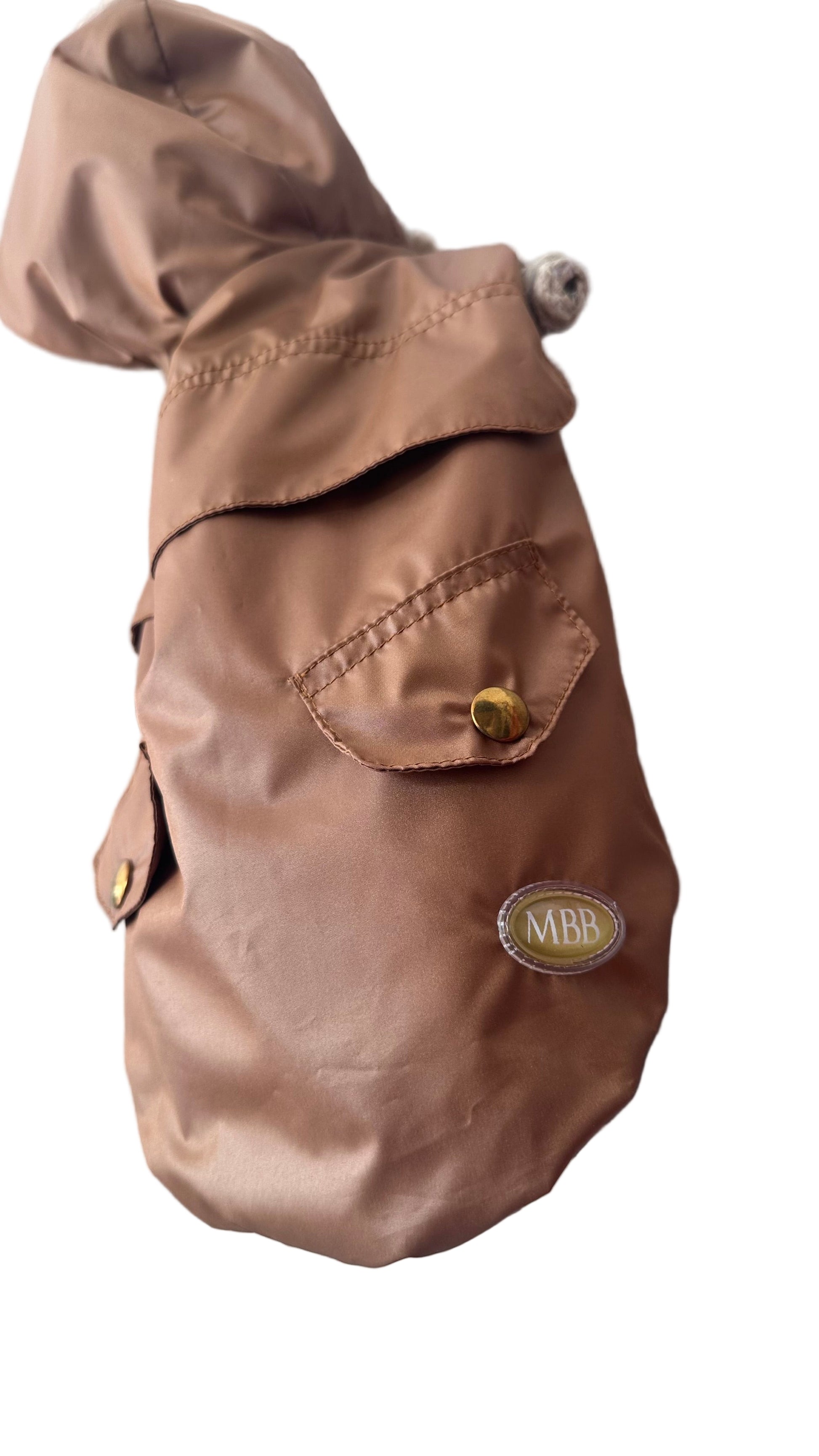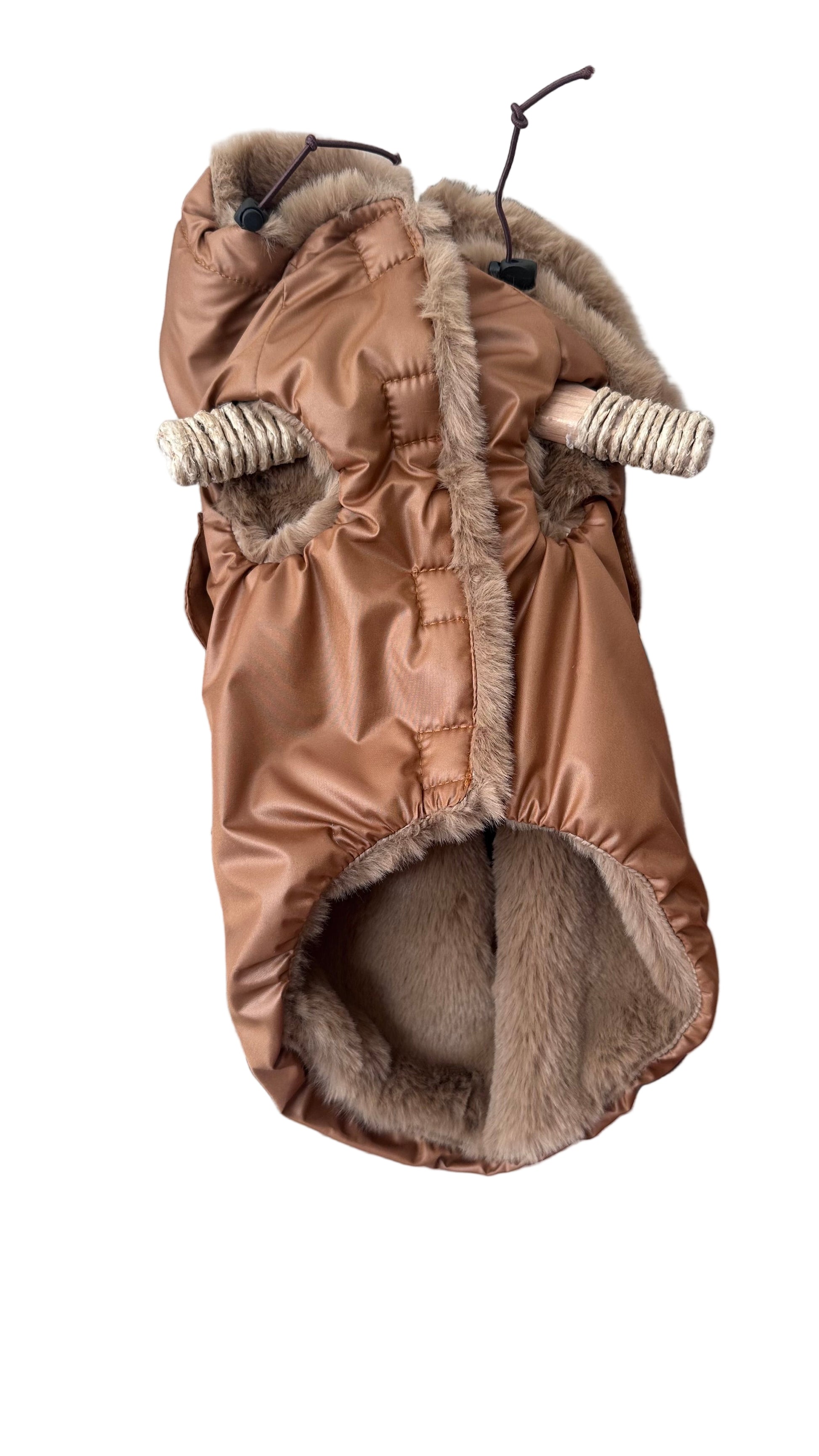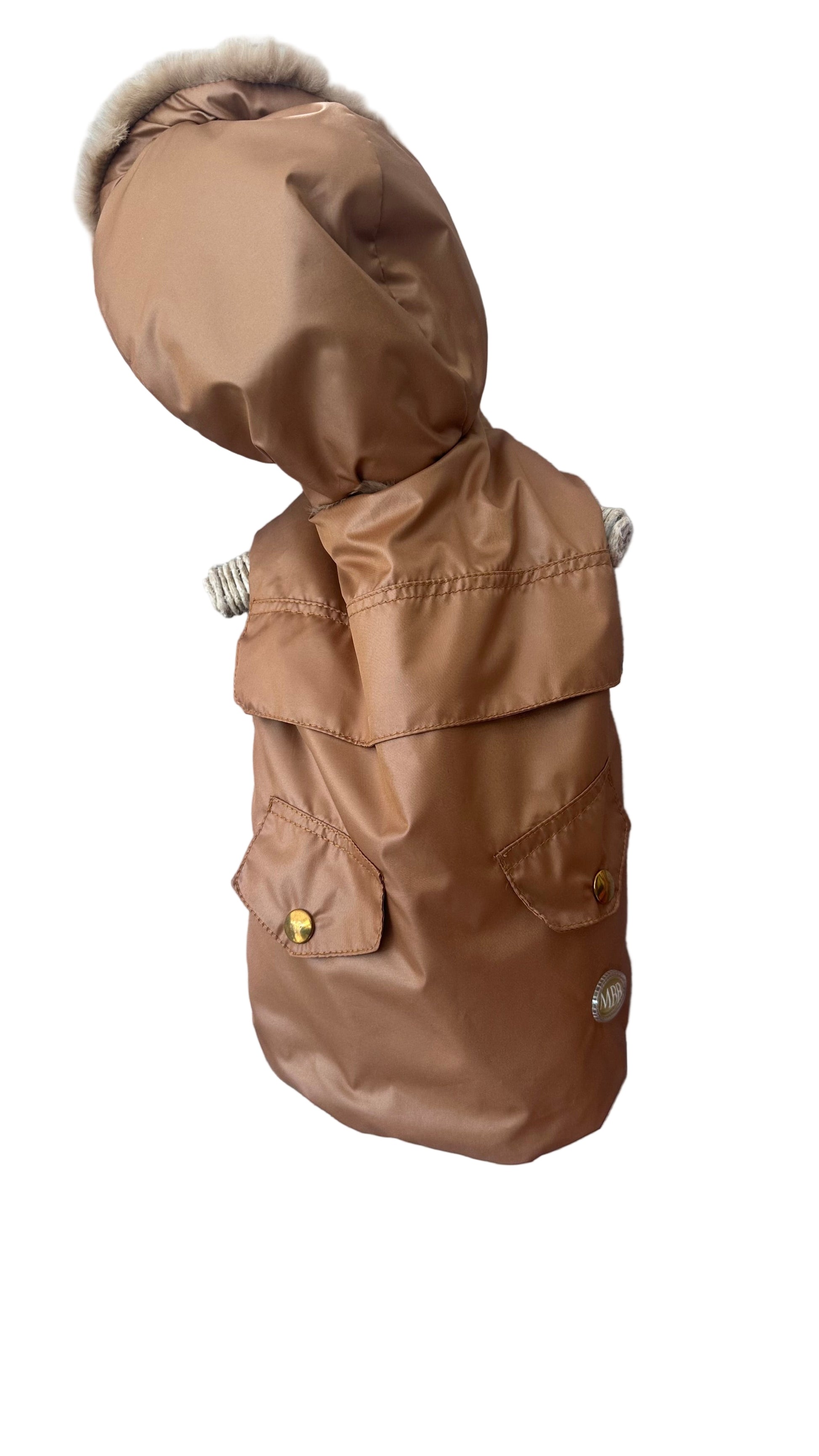 Raffinato ma grintoso, un impermeabile unisex color tabacco con cappuccio e taschine applicate, interno in ecopelliccia tono su tono, chiusura in velcro.