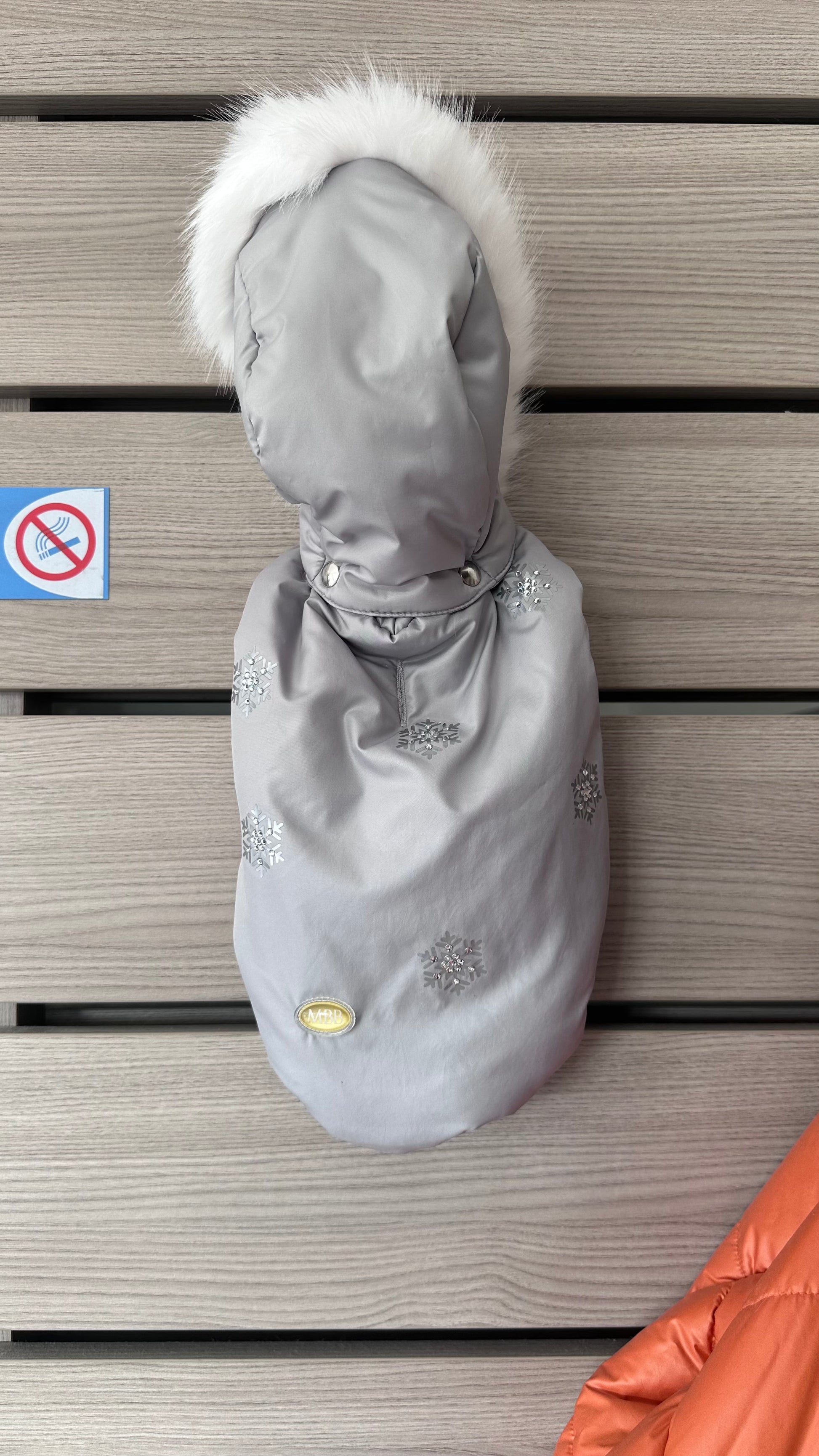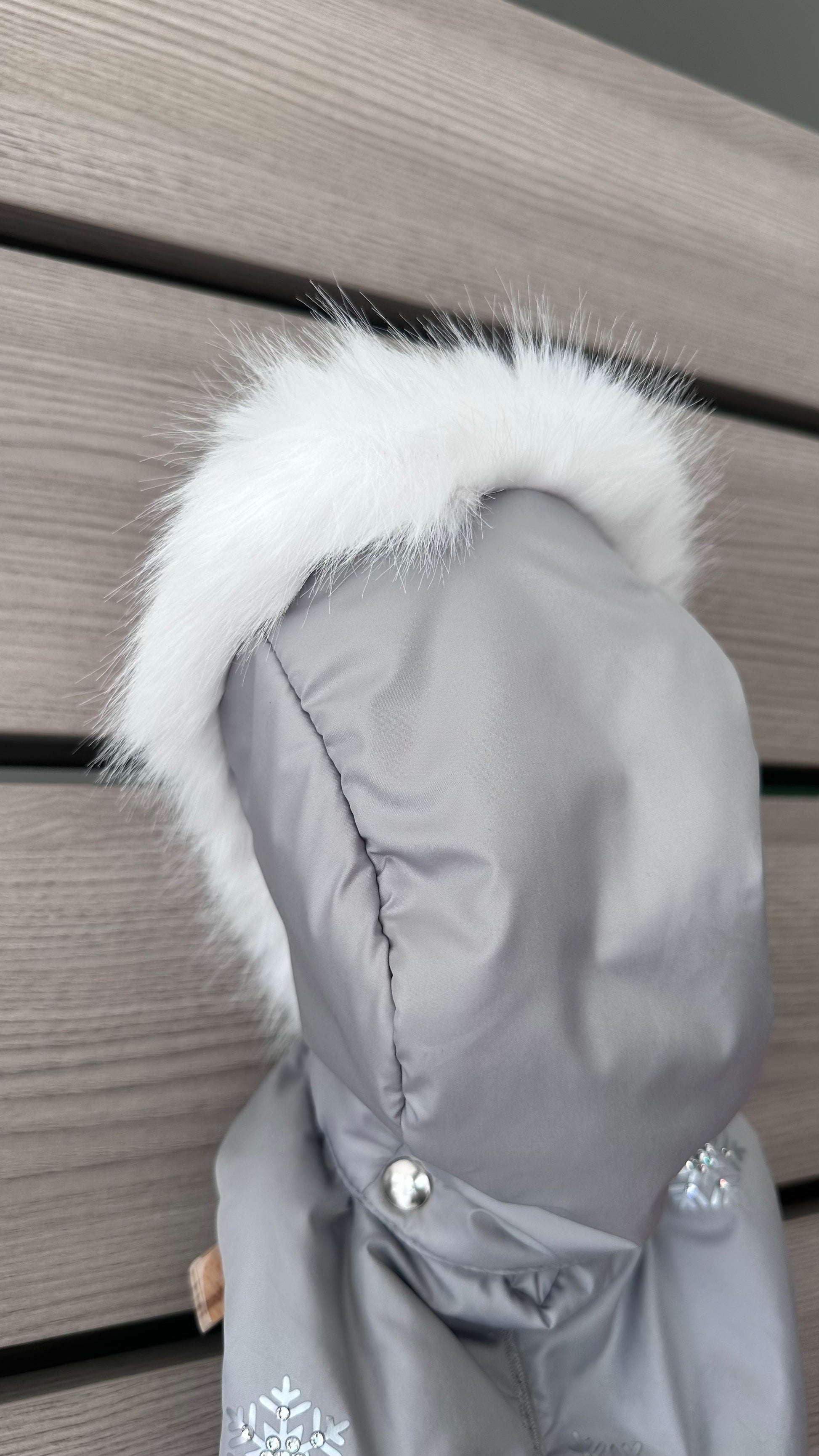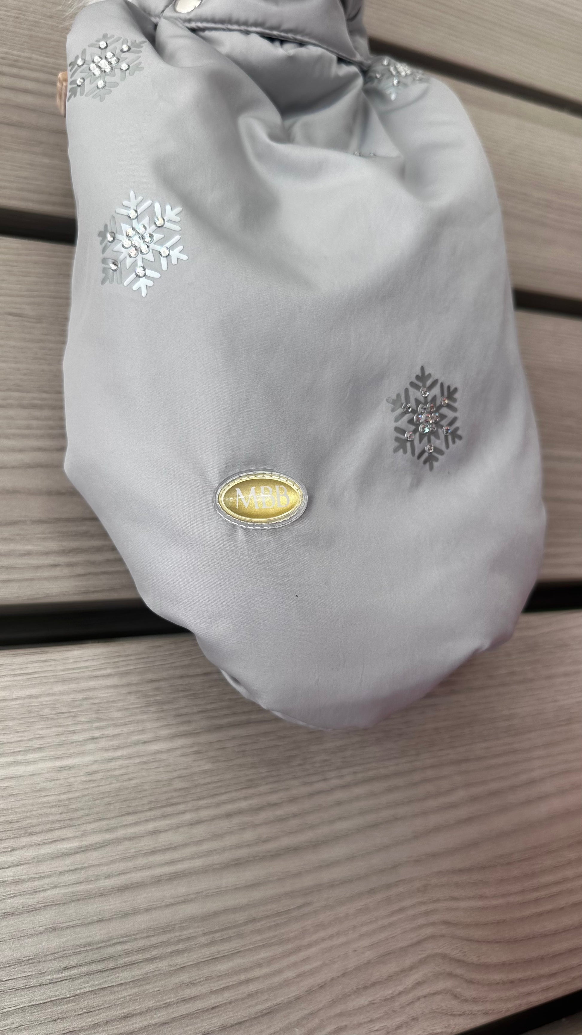 Leggero ma caldo, di un delicato grigio ghiaccio, arricchito da una stampa a cristalli di neve, il piumino Mon Coeur ha la doppia abbottonatura che aiuta il fitting sul cane, cappuccio staccabile bordato di candida ecopelliccia.
